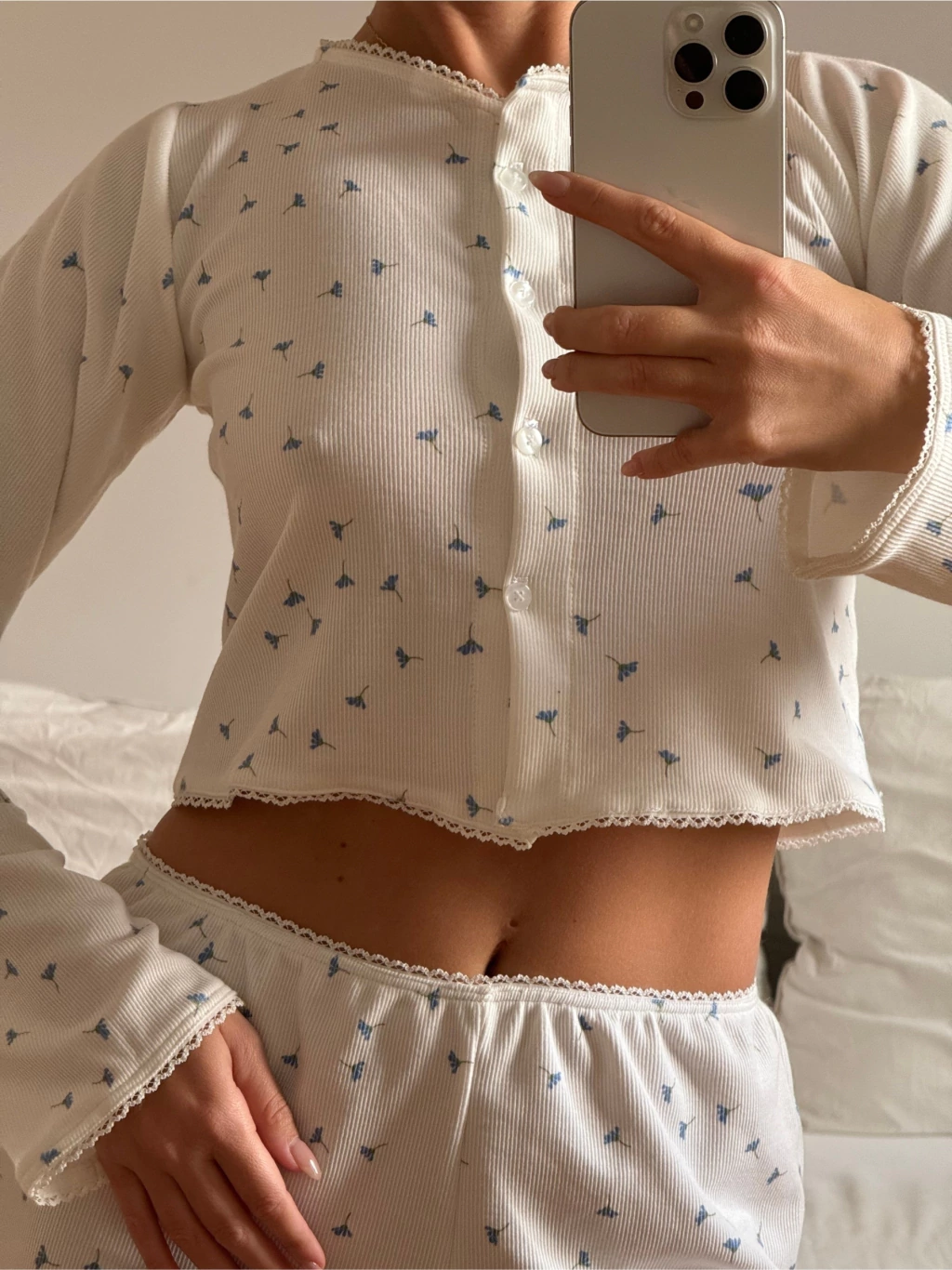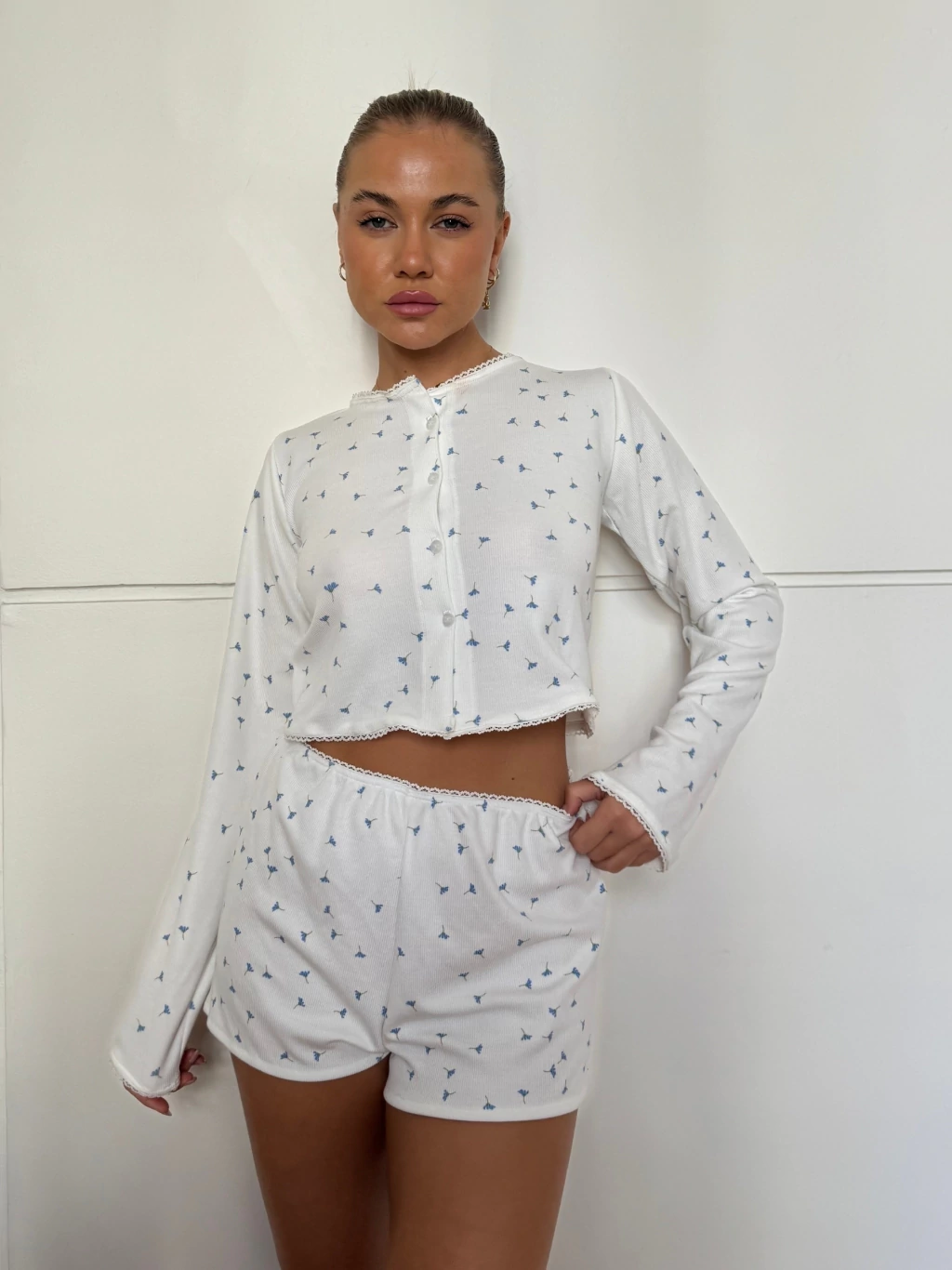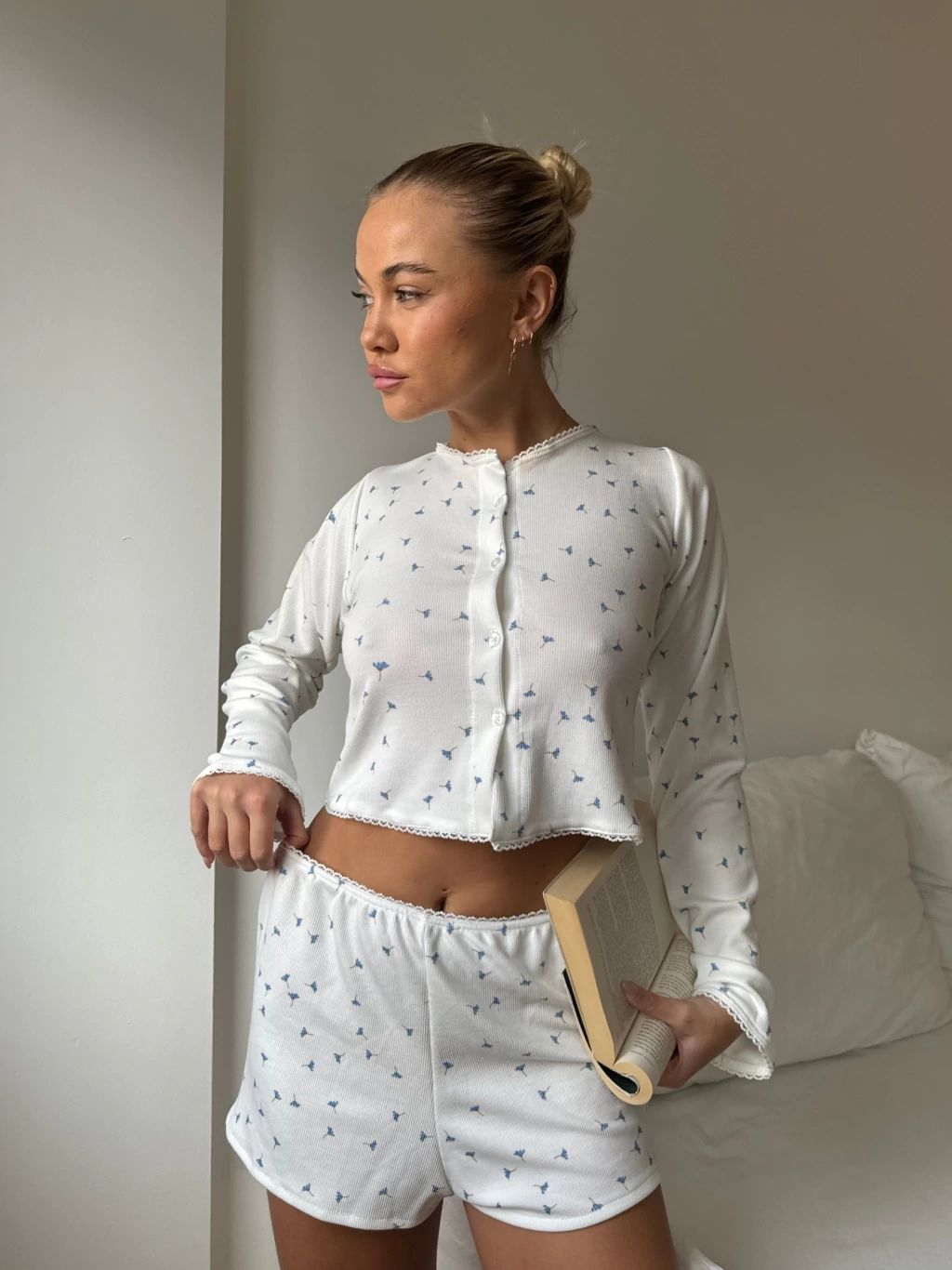 Pijama confeccionado en morley, suavidad y confort para dormir. Conjunto con blusa abotonada y terminaciones en puntilla. Short con cintura elastizada tiro medio/bajo. Detalle de puntilla en cintura. Tu nuevo elegido para acompañarte en sueños.