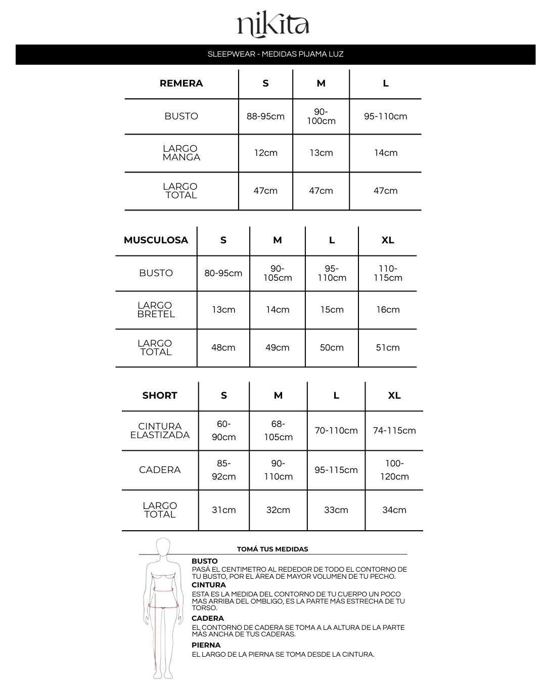 Iara luce un talle S. Sus medidas son: busto 85 / cintura 65 / cadera 85 / altura 1,62.