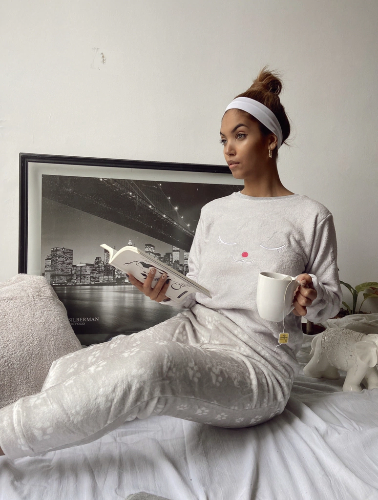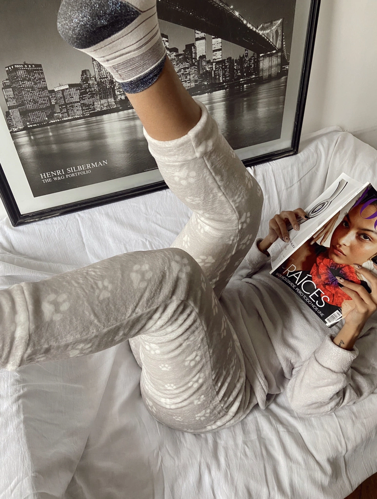 Conjunto confeccionado en polar soft, compuesto por buzo y pantalon. El buzo está bordado en frente central. Terminaciones en puño y cuello redondo. Pantalon sublimado con huellitas, tiro alto. Si bien tiene cintura elastizada, el tejido del resto del conjunto no elastiza. Super suave y abrigado.