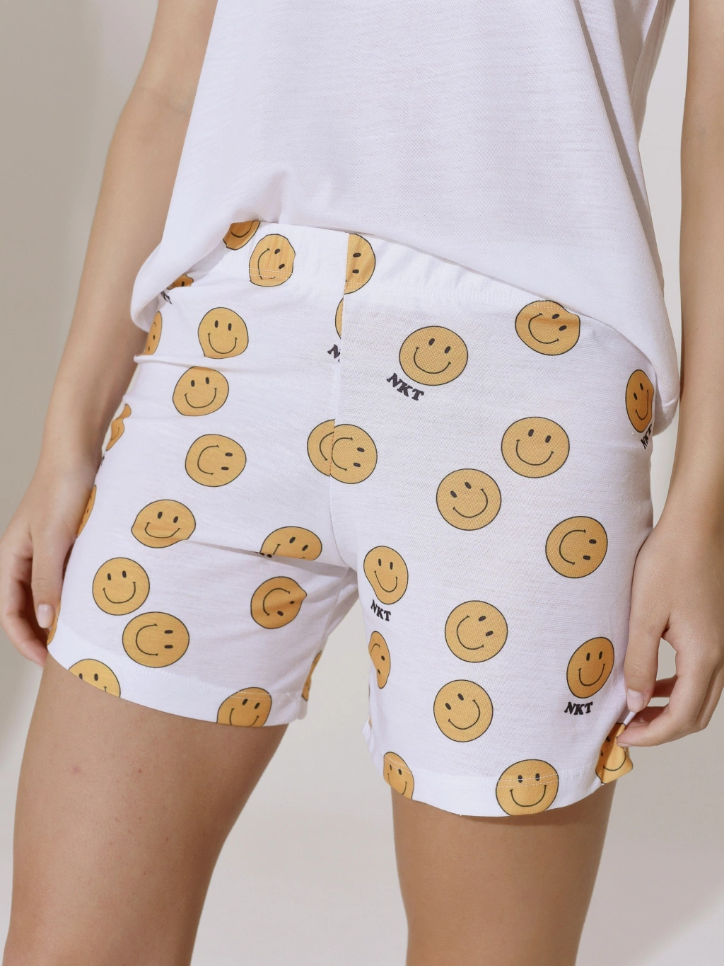 Conjunto de remera y short. Super liviano y fresco. Tela: Algodon Spum 24.1 algodon/poliester. Short estampado tiro alto con elastico en cintura. Remera blanca manga corta, con estampa en frente y espalda. Súper suave al tacto! Ver tabla de talles para comprar el talle correcto. Disponible en 5 talles: S, M, L, XL, XXL.